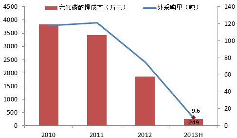 虽然在此期间,作为天赐材料锂离子电池电解液的主要原料--六氟磷酸锂,也由于国内产能较大幅度的提升,其价格同样降幅较大。从2010年335.49元/千克跌至2012年的198.03元/千克。