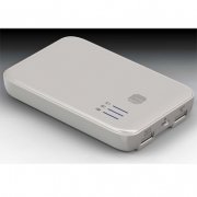 这款移动电源的移动充电装置内置了一块5000mAh的锂离子电池,这个容量甚至比目前笔记本电池的容量还要大一些;虽然它内置的电池容量很大,但是它的体积却并不大,110×70×16.5mm的身材并没有比正常手机大多少,而且白色的机身设计也十分美观。机身的正面是一个银色的按键和三个电源指示灯,三个电源支持等分别显示高、中、低三种电量。在机身的底部设计有三个接口,分别为两个输出电量的USB接口和一个为本机充电用的输入mini USB接口,因此这两个输出接口就可以同时为两个手机进行充电。该机还为可以适用于诺基亚、摩托罗拉、多普达、三星、索尼爱立信以及LG等市面上常见的品牌,使用范围非常的广。