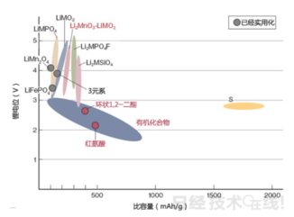 从图1可以看到,理论能量密度比OLO更高的正极材料还有很多,如Li2MPO4F、LiMSiO4、有机化合物等,特别是有机化合物,理论容量最大可达到近1,000mAh/g。而且不使用重金属。因此具备重量轻,资源限制少的优势。不过,有机化合物正极材料的理论能量密度虽然很高,但是锂电位却比较低,大多只有2~3.5V。因此,要想实现与目前的锂离子电池相同的能量密度,至少要找到具备400~600mAh/g容量的有机化合物。目前也有很多日本企业在这方面努力,其中就包括松下、本田、村田制作所(Murata,电子零件专业制造商,已深入锂电领域)等知名企业。