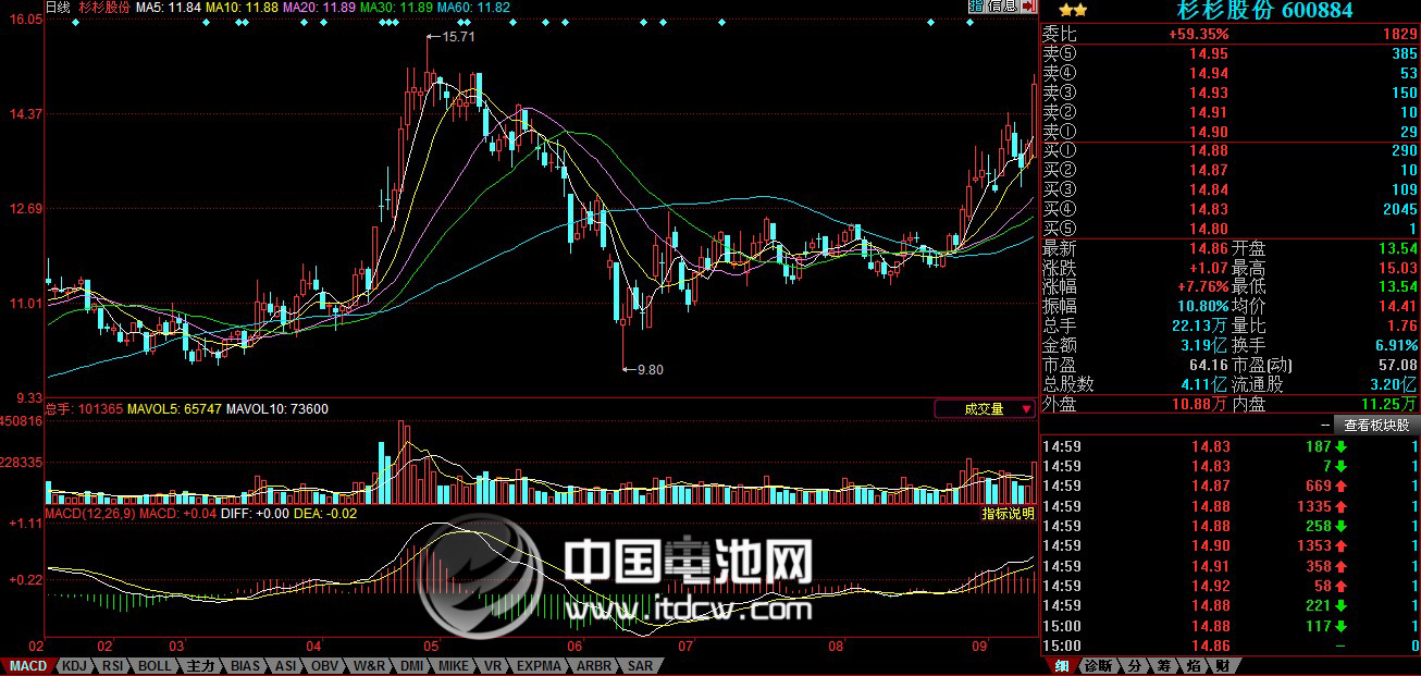 中国电池杂志-中国电池网9月24日讯(肖何 北京报道) 受新能源汽车补贴新政、特斯拉创新高等利好因素影响,前期回调休整的锂电池概念股今日再度放量上攻,尾盘收盘德赛电池(000049)大涨8.18%,收盘价为61.63元,杉杉股份(600884)大涨7.76%,午后一度将触及涨停,尾盘收在14.86元。成飞集成(002190)、佛塑股份(000973)涨幅超过2%,电动自行车概念澳柯玛(600336) 涨幅为6%。