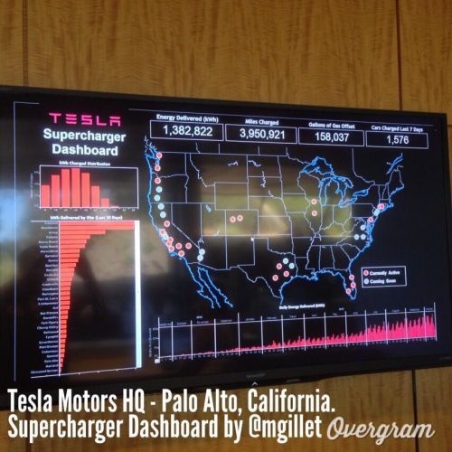 特斯拉汽车公司总部设有一块超级充电站显示屏,通过网络实时获取并反馈美国全境Model S电动汽车的充电状况。
