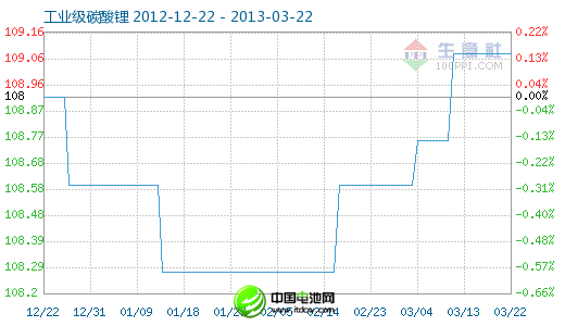 3月22日工业级碳酸锂商品指数为109.08,与昨日持平,较周期内最高点112.10点(2012-11-04)下降了2.69%,较2012年01月05日最低点98.94点上涨了10.25%。(注:周期指2011-09-01至今)