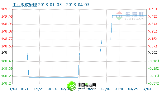 4月3日工业级碳酸锂商品指数为109.08,与昨日持平,较周期内最高点112.10点(2012-11-04)下降了2.69%,较2012年01月05日最低点98.94点上涨了10.25%。(注:周期指2011-09-01至今)