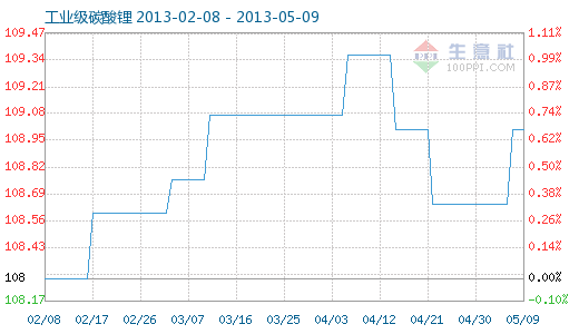 5月9日工业级碳酸锂商品指数为109.01,与昨日持平,较周期内最高点112.10点(2012-11-04)下降了2.76%,较2012年01月05日最低点98.94点上涨了10.18%。