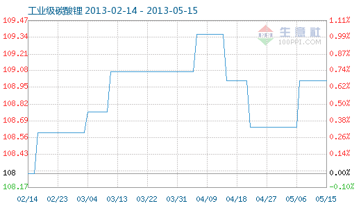5月15日工业级碳酸锂商品指数为109.01,与昨日持平,较周期内最高点112.10点(2012-11-04)下降了2.76%,较2012年01月05日最低点98.94点上涨了10.18%。