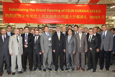 CSUN土耳其工厂总体规划产能包括300MW组件和300MW电池。该工厂的落成投产对于CSUN加快生产制造的全球布局,积极应对欧美双反具有重要的战略意义。在庆典仪式上,CSUN还与项目开发商Sybac公司签署100MW组件供应的框架协议,与土耳其TUV公司签署合作协议。土耳其本地银行AKBANK和ISBANK官方承诺将为CSUN在土耳其和欧洲市场的业务给予支持。