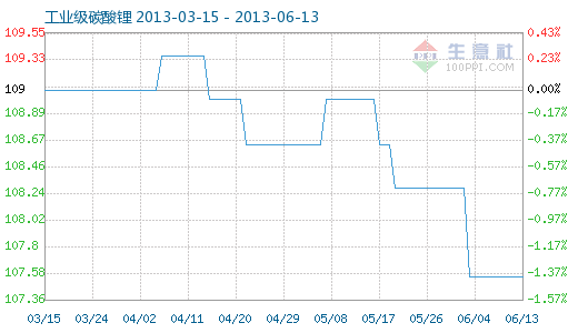 6月13日工业级碳酸锂商品指数为107.55,与昨日持平,较周期内最高点112.10点(2012-11-04)下降了4.06%,较2012年01月05日最低点98.94点上涨了8.70%。(注:周期指2011-09-01至今)