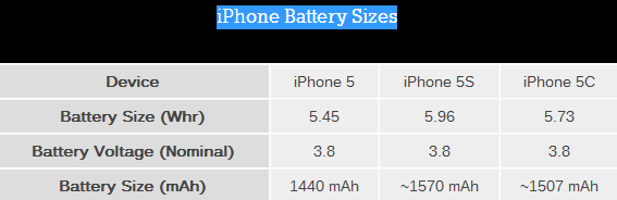iPhone 5的电池容量为1440毫安、5.45Whr,iPhone 5C增大到了1507毫安、5.73Whr,iPhone 5S则进一步增至1570毫安、5.96Whr。电压全部都是3.8V。