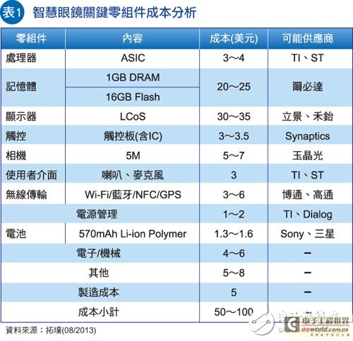 针对各项智能眼镜关键零组件成本落点(表1),据分析,整合近距离无线通信(NFC)、蓝牙(Bluetooth)、无线区域网络(Wi-Fi)和调频(FM)的四合一无线传输模块,可望以3-6美元的价格及低占位体积优势获得原始设备制造厂(OEM)青睐;至于处理器部分,厂商将倾向采用专用集成电路(ASIC),可能供应商为德州仪器(TI)及意法半导体(ST),每颗芯片成本约3-4美元;此外,厂商将采用同样具低成本优势的硅基液晶 (LCoS)方案做为显示面板,成本约30~35美元,可能供应商为台商立景及禾鈶。总体而言,若供应链厂商可控制各项零组件成本于理想价格区间,则智能眼镜成本将仅50~100美元,仍可为品牌厂带来可观获利。