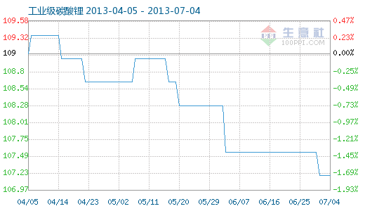 7月4日工业级碳酸锂商品指数为107.19,与昨日持平,较周期内最高点112.10点(2012-11-04)下降了4.38%,较2012年01月05日最低点98.94点上涨了8.34%。(注:周期指2011-09-01至今)