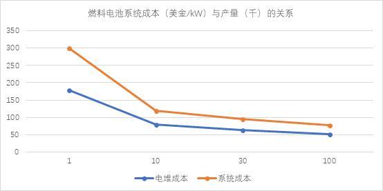 据美国能源部最新数据显示,以80kW质子交换膜燃料电池系统为例,2017年,每生产1000套燃料电池,燃料电池系统(包括燃料电池电堆、高压储氢罐、升压变频器、电动机、动力控制单元等)的成本达到179美元/kW,其中电堆成本为118美元/kW;每生产1万套燃料电池,燃料电池系统成本为79美元/kW,其中电堆成本为39美元/kW。