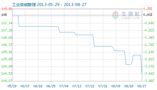 8月27日工业级碳酸锂商品指数为104.46,较昨日下降了1.27点,较周期内最高点112.10点(2012-11-04)下降了6.82%,较2012年01月05日最低点98.94点上涨了5.58%。(注:周期指2011-09-01至今)