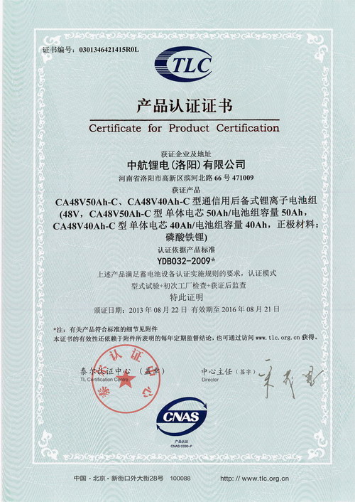 8月30日,中航锂电成功获得CA48V50Ah-C、CA48V40Ah-C型通信用后备式锂离子电池组泰尔认证证书,这标志着公司CA48V50Ah-C、CA48V40Ah-C型通信用后备式锂离子电池组获得通信行业国家级认可,为公司开拓通信行业市场奠定了坚实基础。