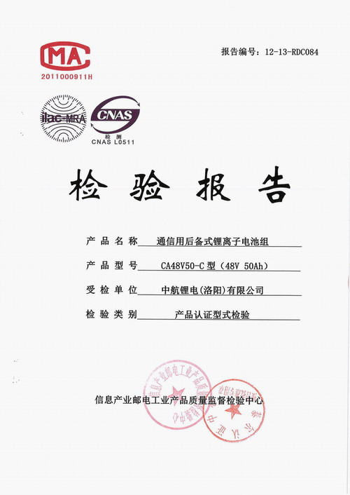 8月30日,中航锂电成功获得CA48V50Ah-C、CA48V40Ah-C型通信用后备式锂离子电池组泰尔认证证书,这标志着公司CA48V50Ah-C、CA48V40Ah-C型通信用后备式锂离子电池组获得通信行业国家级认可,为公司开拓