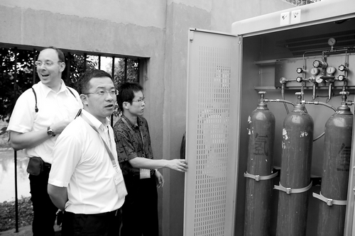 一人多高的长方体大柜子,上面标注着电流、电压和功率等字样,3、4个这样的柜子间隔摆开,还有一个共同的名字:燃料电池发动机测试平台。在这些机器不远处的一个小实验室里头,地上布满管线,风扇高速运转散热,所有的管线都连接在一个黑色的大家伙身上,那是用来发电的燃料电池。在机器的轰鸣声中,是实验室外头停放的一辆辆电动车,有的是2010年上海世博会时的示范车辆,它们使用的都是燃料电池。