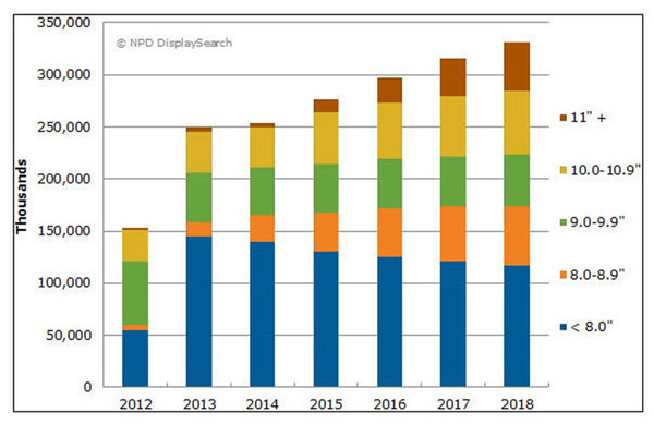 NPD DisplaySearch把平板电脑销量增速放缓的主要原因归结为平板电脑、笔记本和智能手机显示屏尺寸日趋重迭。7-7.9英寸平板电脑的销量将受到智能手机和平板手机的蚕食。7-7.9英寸平板电脑的市场份额将由今年的55%下滑至2018年的35%。