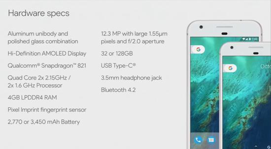 5英寸的Pixel和5.5英寸的Pixel XL拥有完全相同的基础硬件配置,包括骁龙821处理器,4GB的RAM+32/128GB的ROM,并支持内存卡扩展。后置1200万像素、f/2.0镜头,支持光学防抖,前置800万像素镜头。配备USB-C接口、指纹识别模块以及3.5毫米的耳机接口。