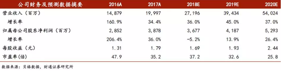 东兴证券预计公司2018~2020年营业收入分别为326.83亿元、440.36亿元和609.63亿元,归母净利润分别为38.68亿元、52.06亿元和69.76亿元,EPS分别为1.76元、2.37元和3.18元,对应PE分别为35.67倍、26.50倍和19.78倍。維持“强烈推荐”评级。