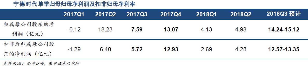 受新能源汽车补贴金额年降预期的影响,新能源汽车会出现年底销售高峰。公司2017年四季度归母净利润和扣非归母净利润环比增速分别为72%、126%。若2018年四季度归母净利润环比增速按照0%或者2017年四季度的72%,则2018年四季度归母净利润约为14.24~24.49亿元,2018年四季度业绩可期。