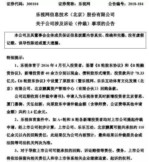 乐视网表示,乐视体育案件中,A+轮和B轮各新增投资者均对上市公司提起仲裁申请,经上市公司初步计算,乐视网、乐乐互动、北京鹏翼可能共承担约110亿余元以内的回购责任,此结果仅为公司内部预计,最终结果以仲裁委员会或法院等司法机关判决为准。