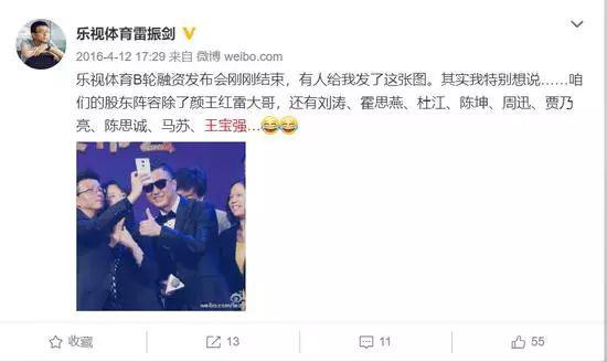 乐视体育投资者阵容强大。一度有两位“中国首富”的身影共同现身——万达集团的王健林以及云锋股权投资的控制人马云。此外,在B轮融资中,除了机构投资者外,还有11名明星投资人,包括刘涛、孙红雷、贾乃亮、周迅、王宝强等,总投资金额不到两亿,占股不到1%。