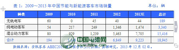 上牌数据显示,从2009年至今,中国节能与新能源客车市场发展很快。2009年时,包括无轨电车、纯电动客车和混合动力客车在内,中国市场共销售194辆,到2012年高达6,849辆,增长了3,430.41%。2013年初预计2013年市场总销量将达到9,223辆,比上年增长34.66%。现在看来,2013年的市场发展实际情况比当初预计的还要好。具体相关数据见表1。
