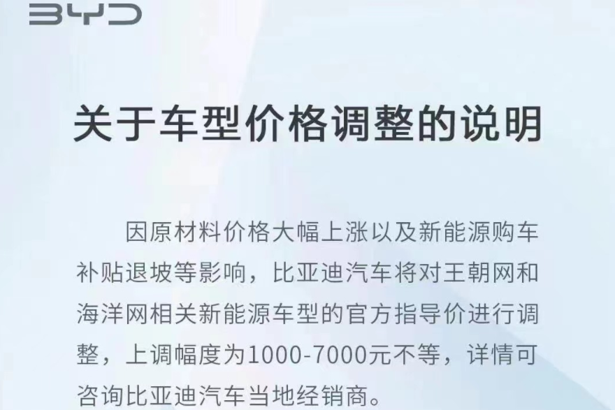 比亚迪将于2月1日起对王朝网和海洋网相关新能源车型的官方指导价进行调整,上调幅度为1000-700 ... 查阅全文 2022-01-22