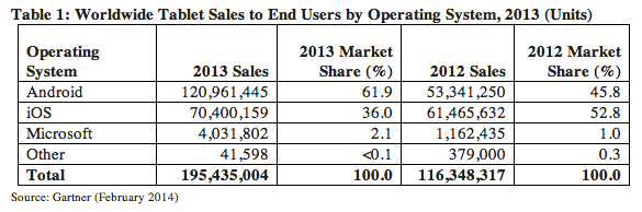 北京时间3月3日消息,据科技博客Techcrunch报道,市场研究机构Gartner今天发布的一份最新报告显示,2013年全球平板电脑销量达到1.95亿部,其中安卓系统产品销量为1.21亿部、占比62%;苹果iPad销量为7000万部、占比36%。