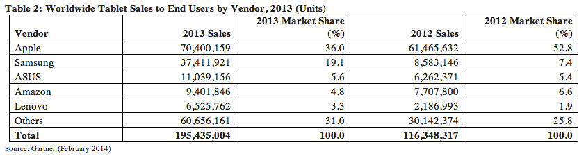 Gartner报告显示,厂商方面,苹果依旧一枝独秀:去年iPad销量达到7000万部,份额为36%;三星凭借Galaxy系列,在平板电脑市场份额突飞猛进:去年三星平板销量为3700万部、占比19%。而在2012年时,苹果在平板电脑市场份额高达53%,而三星份额仅为7%。华硕平板去年销量为1100万部,市场份额为5.6%,列第三。