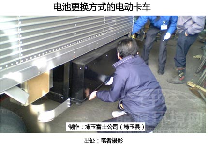 在日本,“改造电动汽车”领域进行着这种方式的尝试。埼玉富士公司制作了采用电池更换方式的电动卡车(载重2吨),并于2011年6月8日通过了车检。媒体对其改造作业的情形也进行了介绍。