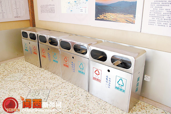 永定二中是全市较早开始做垃圾分类回收的学校。2001年,该校就设立了电池回收点,并时常开展绿色环保的宣传活动。学校每年把收集起来的废旧电池交与该县的垃圾回收站。图为该校教学楼门口的果壳箱,上面设立了电池回收专用孔。 记者 刘玉荣 摄
