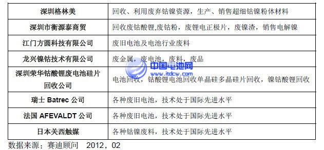 随着锂离子电池的产销量的不断增加,报废的锂离子电池给环境造成了巨大的压力并形成了严重的污染。目前,在河北清河、广东清远、江苏太仓、山东临朐、湖南安化等地形成了全国性的废旧电池集散地,在广东、浙江一带集中了一些回收废旧电池并进行拆解分类的企业。行业内做得最大的锂电回收企业是广东的邦普集团,该集团专注于各种废旧镍氢、镍镉、锂离子等二次电池的回收与处理,在该领域类具有较强的实力。另外还有深圳市衡源泰商贸有限公司、潮州澳佳化工厂、深圳荣华钴酸锂废电池硅片回收公司、龙兴镍钴技术有限公司等电池回收公司。但这些从事锂离子电池回收利用的企业绝大部分以废料收集、分类等粗加工为目的,并没有对镍、钴、锂等再生资源进行深度处理。而在再生资源深度处理环节,国内目前仅有深圳格林美高新技术股份公司。