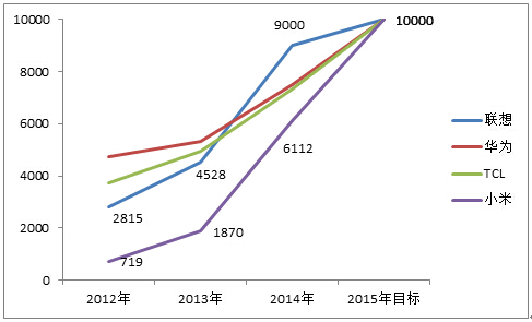 2015年是个关键节点,这一年将有几家国产手机厂商的年销量超过1亿部。曾对外表态2015年目标是超1亿部的厂商有5家。中兴三年前年销量已经近7000万部,三年目标中提过,但历经亏损转型,目前看不现实。而且中兴终端事业部CEO曾学忠曾明确表示,2015年中兴智能手机销量目标是6000万部,按当前手机市场智能机占比90%倒推,2015年中兴全部手机销量目标在6600-7000万部。剩下的四家分别是联想、华为、TCL、小米,我们来逐一分析一下。