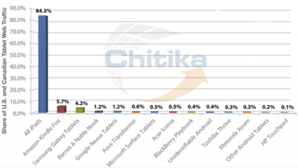 从统计结果中可以看出,在Chitika的统计范围之内,有84.3%的网络数据流量来自于iPad。相比之下虽然竞争对手三星的平板电脑型号可谓非常之多,但是所占比重仅有4.2%,仅位列第三。虽然对于平板电脑用户来说,各种应用的使用频率要远高于浏览网页,不过这也不足以解释iPad为何拥有如此巨大的优势。