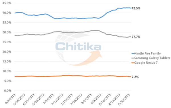 从Chitika对今年6月至8月的数据流量的统计来看,iPad依然保持着平板电脑市场的霸主地位。虽然谷歌在今年7月发布了新一代的Nexus 7平板电脑,但是Android平板在所有网络数据流量中的比重却没有明显的增长。虽然与iPad的差距很大,但是亚马逊的Kindle Fire系列平板电脑还是凭借着较高的性价比以5.7%的份额位居次席。