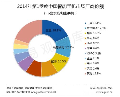 根据EnfoDesk易观智库的《中国手机市场季度监测报告2014年第1季度》显示,第1季度无论从普通手机还是智能手机市场厂商份额上来讲,华为均略胜小米一筹。