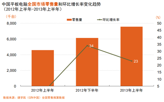 8月22日下午消息,捷孚凯(GfK中国)近日发布《中国平板电脑市场2013年上半年回顾与展望》,2013年上半年(含在线市场)零售量为758万台,同比增长65%,较比2012年下半年则上涨了23%。