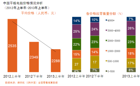 根据捷孚凯(GfK中国)全国零售推算数据报告所示,我们可以清晰的看到平板电脑平均价格走势的下降趋势。2013年上半年(含在线市场)平板电脑平均价格为人民币2288元,与2012年同期相比下降10%,较2012年下半年也下降了3%。而低端价位,即500元以下的价格段,零售量的占比则由2012年上半年的4%上升到2013年上半年的8%,增加4个百分点。