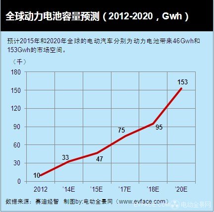 从电动汽车来看,预计2015年和2020年全球的电动汽车的产量分别为430万辆和1100万辆,而其中包含EV、PHEV和HEV,其动力电池单位容量平均分别为50Kwh、10Kwh和2Kwh,2015年和2020年分别为动力电池带来46Gwh和153Gwh的市场空间。