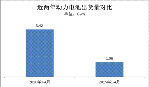 源于政策红利的引导辅以私人消费信心的培育以及充电基础设施等多方面的发展,新能源汽车市场也逐步走向稳增长。据中汽协数据统计,2016年1-4月新能源汽车产量94442辆,比上年同期增长126.8%。而作为核心零部件的动力电池也跟随新能源汽车整体市场走向,呈现高增长趋势。据第一电动研究院数据梳理,2016年1-4月动力电池出货量达3.42Gwh,较之去年同期1.06wh的出货量实现同比增长2.38倍。(注释:以下动力电池数据源于新能源汽车产量与其搭载的电池容量乘积。由于未考虑其他影响因素,总体实际产能会略高于此。电池出货量计算公式:车型搭载电池容量*车型产量。