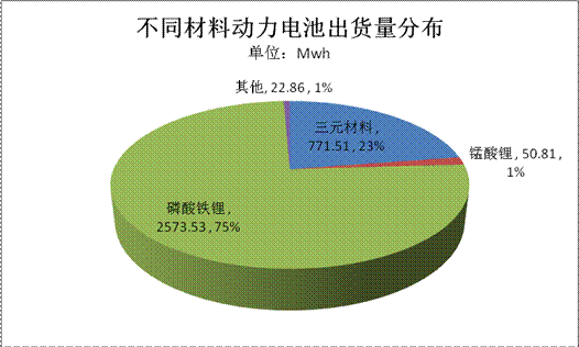 目前电池类型主要为磷酸铁锂和三元材料,两者累计出货量达3.34Gwh,占比总量的97.66%。对比两种电池材料的应用领域看,两者在乘用车、客车、专用车领域均有分布,但磷酸铁锂电池主要集中应用于客车、乘用车领域,两部分电池出货量分布为1.5Gwh 和1Gwh,均超过1Gwh,占比磷酸铁锂电池总量(2.57Gwh)的97%;而三元材料电池受制于政府此前暂停三元锂电池客车列入新能源汽车推广应用推荐车型目录,使得该类型电池主要集中应用于乘用车领域。