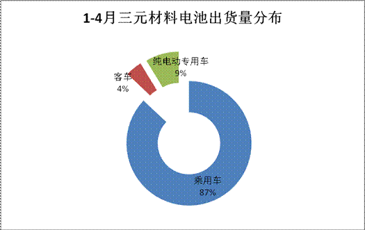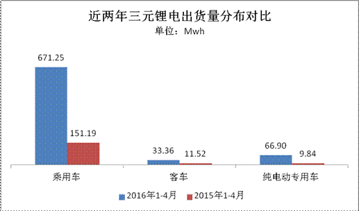 三元锂电池方面,此前政策要求暂停三元锂电应用于客车领域,但从今年与去年同期出货量数据比较看,这对三元锂电的总产能并未造成太大影响,与2015年1-4月三元锂电池出货量(172.55Mwh)对比,今年实现了3.47倍的同比增幅,净增量达600Mwh。细分看,三元锂电在客车领域的变化基本不达,仅增21Mwh左右;对应的其产能在乘用车领域的增幅最为明显,同比增幅达3.44倍,净增量达520Mwh;其次,三元锂电在专用车领域的变化也伴随专用车产量的走势逐步递增,电池搭载量增量达57Mwh,增幅达5.7倍。