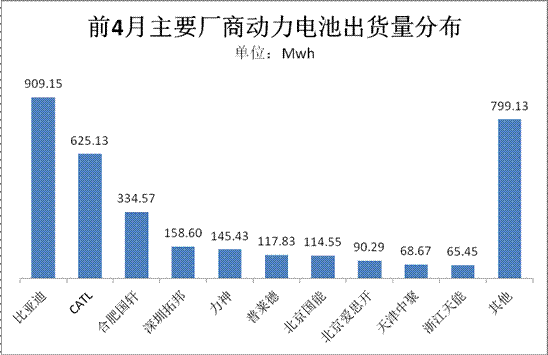 细分动力电池生产厂商看,前4月电池有产量的厂商数量近90家,其中排名前10位的厂商电池出货量累计达2.63Gwh,占比高达77%;而出货量超过100Mwh的厂商数量仅7家:比亚迪、CATL、国轩高科、深圳拓邦、力神、普莱德、国能,7家电池出货量累计达2.4Gwh,占比70%。