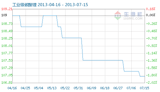 7月15日工业级碳酸锂商品指数为107.01,与昨日持平,较周期内最高点112.10点(2012-11-04)下降了4.54%,较2012年01月05日最低点98.94点上涨了8.16%。(注:周期指2011-09-01至今)