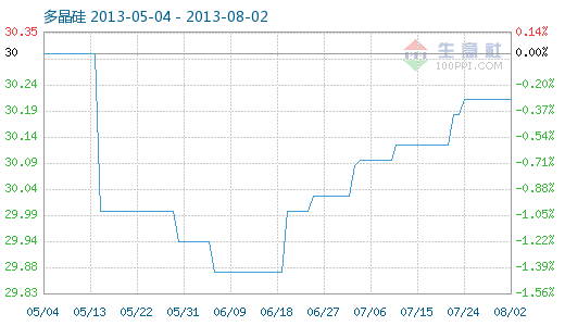 8月2日多晶硅商品指数为30.22,与昨日持平,较周期内最高点100.00点(2011-09-08)下降了69.78%,较2012年12月24日最低点29.12点上涨了3.78%。(注:周期指2011-09-01至今)
