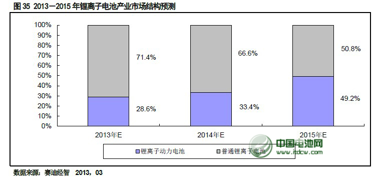 从锂离子电池市场结构来看,中国电池网战略合作机构——赛迪顾问认为,锂离子市场规模未来三年内增长的动力来自于以新能源汽车电池为代表的动力电池。到2015 年锂离子动力电池市场规模占比将达到49.2%。