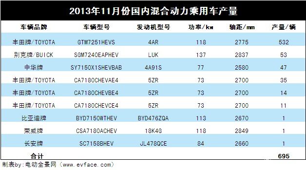 11月份我国国内混合动力乘用车产量695辆,其中插电式混合动力乘用车仅1辆,为比亚迪最新上市插电式混合动力车型“秦”。与纯电动汽车市场的大起大落相比,今年以来国内混合动力乘用车各