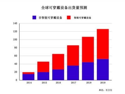 研究机构IDC预测,全球可穿戴设备2015年的出货量将达到4570万,而2019年的出货量将达到1.261亿,这意味着大约45%的年增长率。