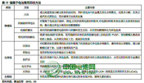 目前废锂离子电池的回收利用研究主要集中于电池中正极活性物质的回收利用方法。一般来说,根据所采用的主要关键技术,可以将废锂离子电池的资源化处理过程分为物理法、化学法和生物法这三类。