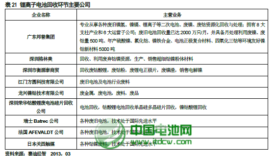 目前,在河北清河、广东清远、江苏太仓、山东临朐、湖南安化等地形成了全国性的废旧电池集散地,在广东、浙江一带集中了一些回收废旧电池并进行拆解分类的企业。行业内做得最大的锂电回收企业是广东的邦普集团,该集团专注于各种废旧镍氢、镍镉、锂离子等二次电池的回收与处理,在该领域类具有较强的实力。另外还有深圳市衡源泰商贸有限公司、潮州澳佳化工厂、深圳荣华钴酸锂废电池硅片回收公司、龙兴镍钴技术有限公司等电池回收公司。但这些从事锂离子电池回收利用的企业绝大部分以废料收集、分类等粗加工为目的,并没有对镍、钴、锂等再生资源进行深度处理。而在再生资源深度处理环节,国内目前仅有深圳格林美高新技术股份公司。